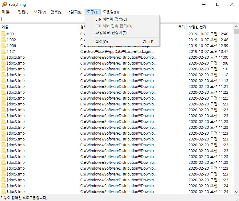 Everything이 파일을 다 찾았으면 아래와 같이 파일들이 쫙 나열됩니다.
