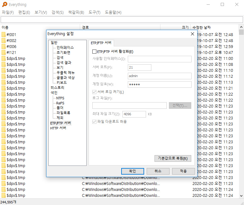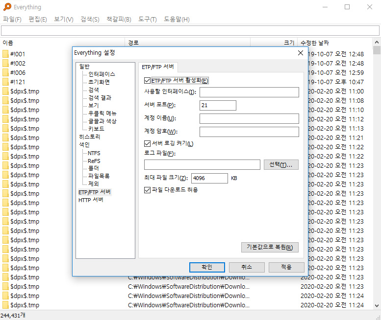 Everything 설정을 띄우시고 "ETP/FTP 서버"를 눌려 줍시다!