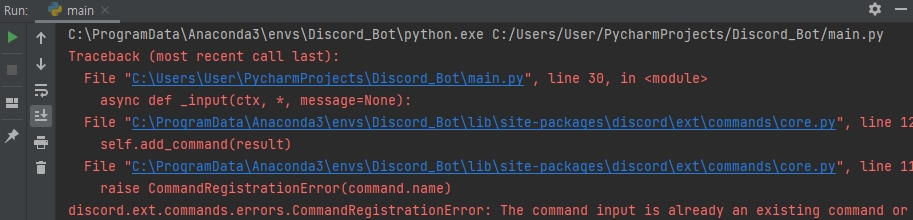 | = 애러코드 = discord.ext.commands.errors.CommandRegistrationError: The command input is already an existing command or alias. |
