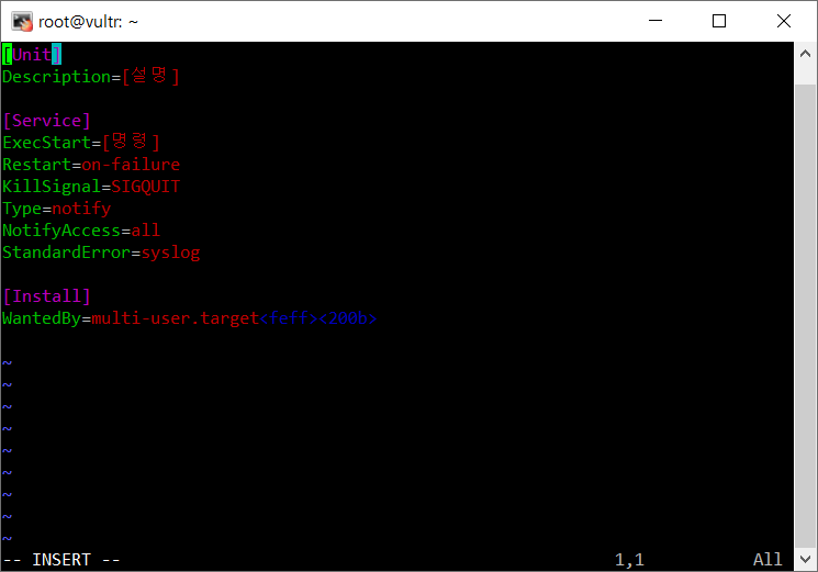 " i "를 입력하여, 작성 모드를 시작하고 해당 파일을 다음과 같이 작성합니다.