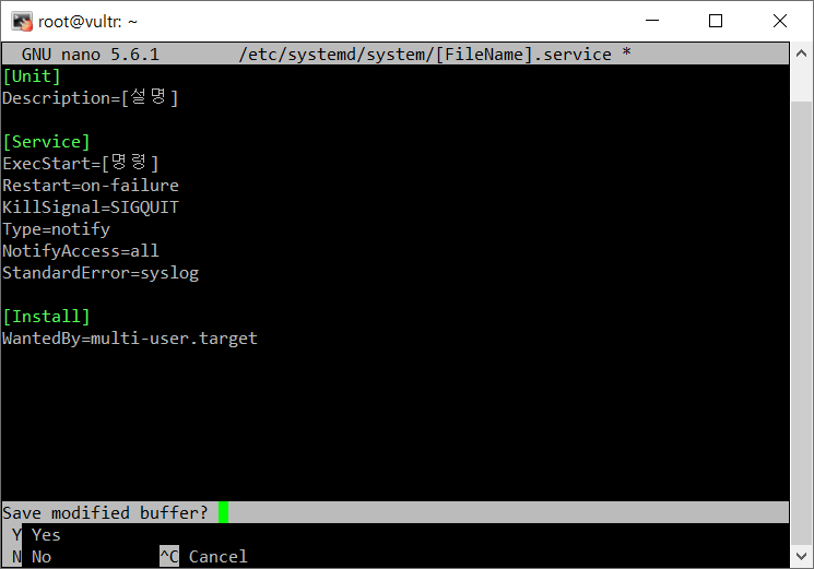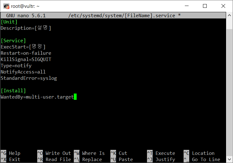 "[설명]"에는 서비스 설명을, "[명령]"에는 해당 Service에서 사용할 명령을 입력합니다.