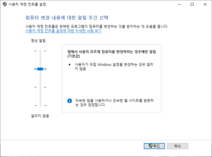 UAC 3단계가 기본값이기 때문에, 대부분의 컴퓨터가 UAC 3단계로 되어있습니다.