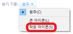 ![]() 2-1. 보기기준 옆 "범주"를 눌려주세요. ![]() 2-2. "범주"에서 "작은 아이콘"으로 바꿔주세요. |