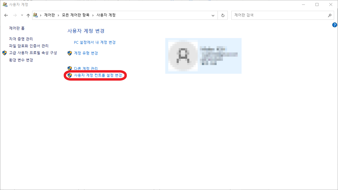 4. "사용자 계정 컨트롤 설정 변경"을 선택합니다.