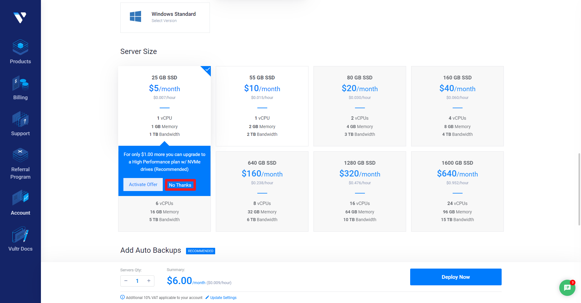 4. 원하는 서버 옵션을 선택하고 "Deploy Now"를 누르면 됩니다.