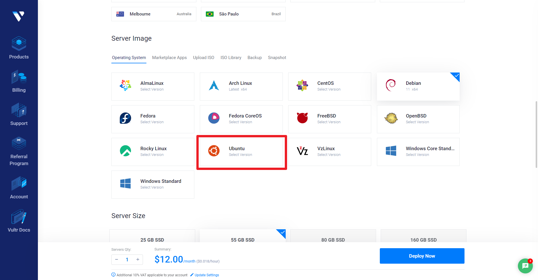 ![]() 5. "Cloud Compute"를 선택합니다. ![]() 6. 스크롤을 내린후, "intel Regular Performance"과 "Seoul"을 선택합니다. ![]() 7. 사용하고자 하는 OS를 선택해주세요. (만약, 처음 사용하여, 어떤 OS를 골라야할지 모르겠다면, 아래 7-1, 7-2를 참고해주세요.) ![]() 7-1. "Ubuntu"를 선택합니다. ![]() 7-2. "22.04 LTS x64"를 선택해주세요. ![]() 8. "25 GB SSD"를 선택합니다. ![]() 9. 매달 1$를 추가하면 SSD가 아닌, NVME를 사용할 수 있다는 내용의 안내문이지만, 필요없기 때문에 "No Thanks"를 클릭합니다. ![]() 10-1(빨간색 상자). 매월 1$를 추가하여 서버를 자동으로 백업하는 서비스입니다. Snapshot이라는 기능을 통해, 추후에 원하는 지점에서 백업을 진행할 수 있어, 크게 중요하지 않고 권장하지않지만, 원하시는대로 진행하시며 됩니다. 10-2(파란색 상자). 원하시는 옵션이 있다면 설정을 하시면 됩니다. (잘 모르겠다면 나두시면 됩니다.) ![]() 11. 나중에 서버 관리를 편리하게 하기 위해서 "Enter Server hostname"에 원하시는 이름을 입력해주세요. (이름을 입력하지 않아도 괜찮으며, 입력시 "Enter server label"은 자동으로 입력됩니다.) 12. "Deploy Now"를 눌려 서버 대여를 시작하시면 됩니다. |