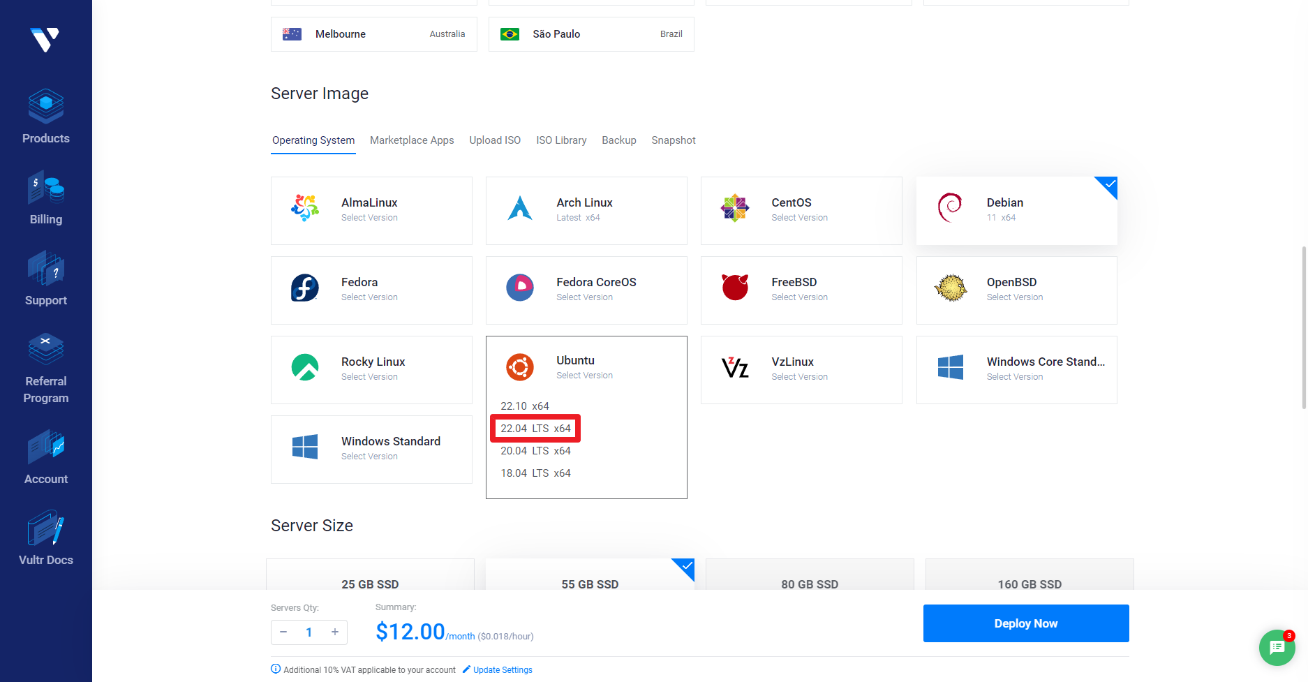 (파란색 상자의 경우, 이미 사용하고있는 서버가 있어서 나타나는 것입니다. Vultr 사용이 처음인 경우, 나타나지 않습니다.)