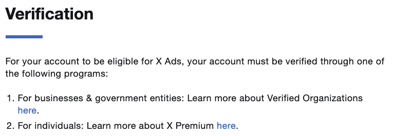 엥...? 광고를 위해서는 계정 인증(인증 마크)이 필요하는데, 이를 위해서는 X Premium에 가입이 필수라고 합니다.