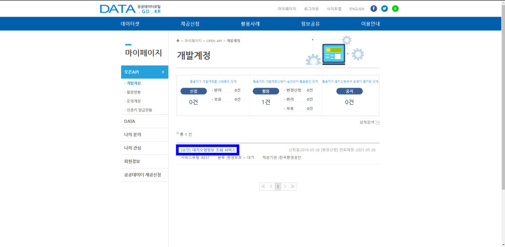 위 화면에서 방금 신청했던 “대기오염정보 조회 서비스”를 눌려줍시다!