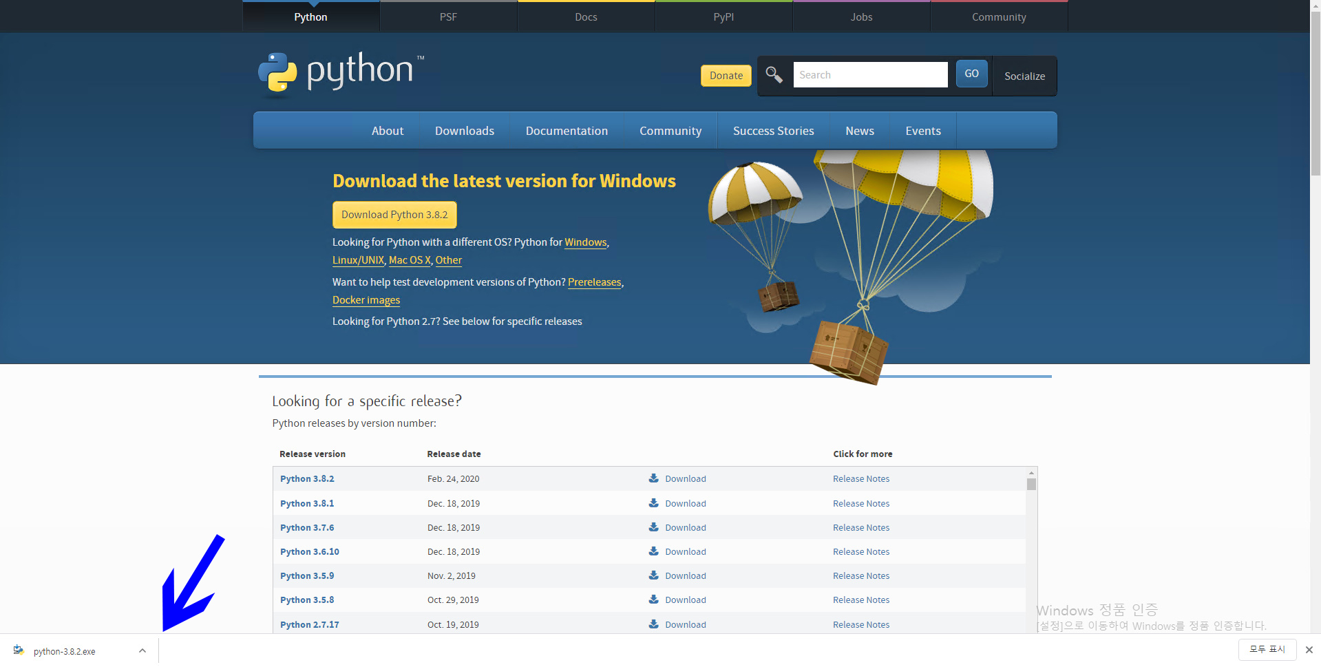 그럼 설치를 하기 위해 Python 공식 홈페이지인 "여기"(python.org)로 이동해줍시다!