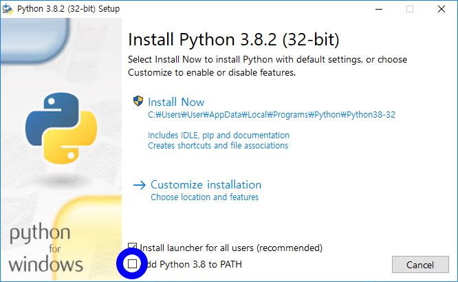 파란색 원 부분인 "Add Python (Python 버전) to PATH"부분을 꼭 다음 화면과 같이 체크 해주셔야지 Python을 원활하게 사용할 수 있습니다!